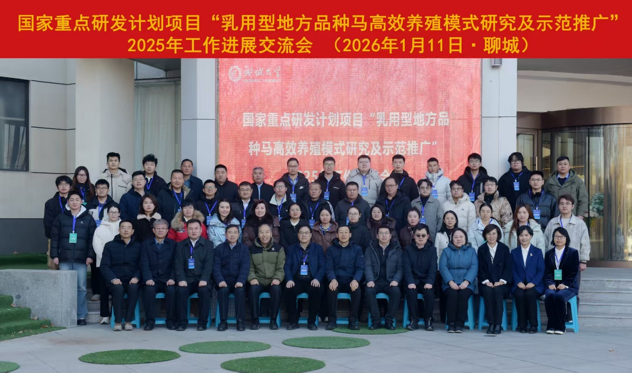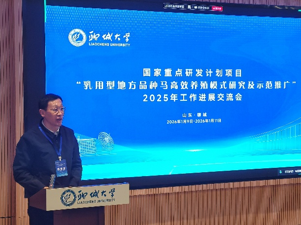 1月11日,国家重点研发计划项目“乳用型地方品种马高效养殖模式研究及示范推广”2025年工作进展交流会在聊城大学成功召开,聊城大学党委常委、副校长聂广明出席会议并致辞。来自全国多所高校、科研院所及企业示范基地的50余位专家学者齐聚一堂,深入交流项目实施中的技术难题、成果转化、合作协同等内容,系统梳理项目实施以来的工作进展、成果亮点与存在问题,统筹规划后续研究任务与示范推广方案,保障项目按计划高质量完成既定目标。