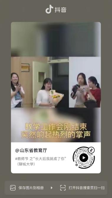 【编者按】9月10日,教师节当天,山东省教育厅微信公众号(视频号)、抖音号、快手号上发布短视频《长大后我就成了你》。视频中,聊城大学音乐与舞蹈学院青年教师为昔日恩师、今日同事送上鲜花和节日祝福,共庆教师节,展现我校尊师重教、薪火相传的良好校风。