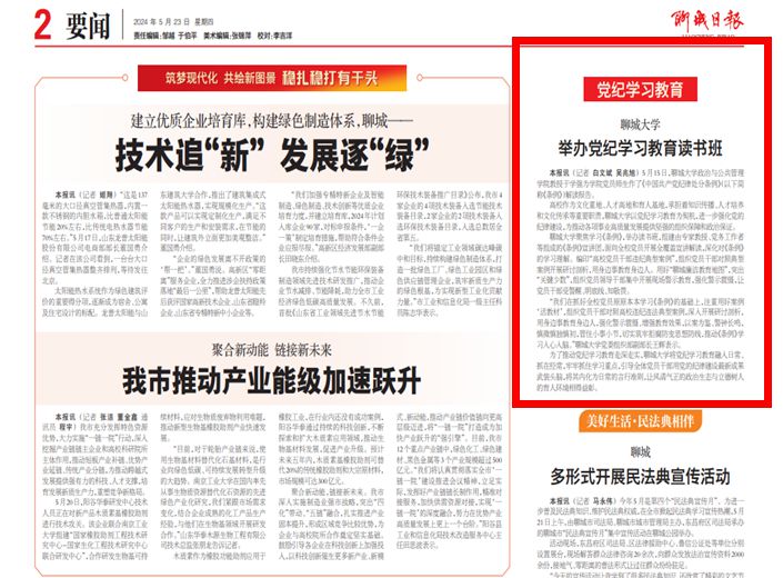 【聊城日报】报道聊城大学举办党纪学习教育读书班