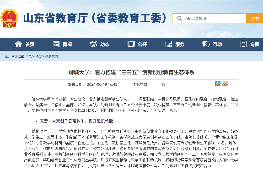 【山东省教育厅(省教育工委)】发布聊城大学:着力构建“三三五”创新创业教育生态体系