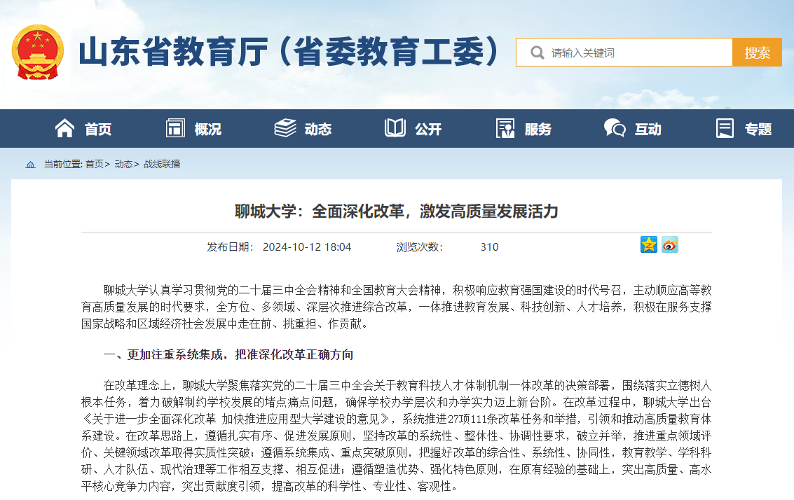 【编者按】10月12日,山东省教育厅(省委教育工委)以《聊城大学:全面深化改革,激发高质量发展活力》为题,报道了我校深入推进综合改革,在教育发展、科技创新、人才培养、服务社会等方面的先进作法和经验。