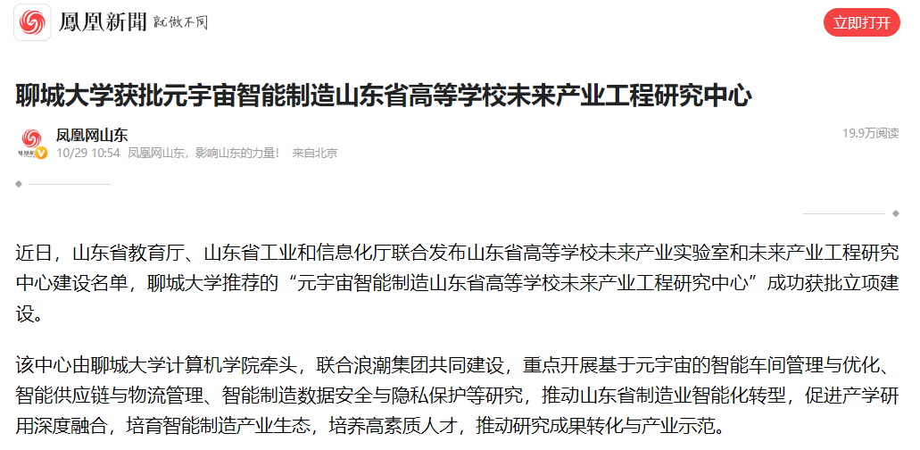 【凤凰网】报道:聊城大学获批元宇宙智能制造山东省高等学校未来产业工程研究中心