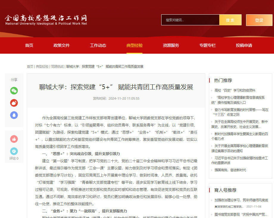 【编者按】11月20日,全国高校思想政治工作网以《聊城大学:探索党建“5+” 赋能共青团工作高质量发展》为题在典型经验专栏报道了我校团委党支部探索构建党建“5+”模式,推动党建与业务工作互融互促的全国样板党支部建设经验。