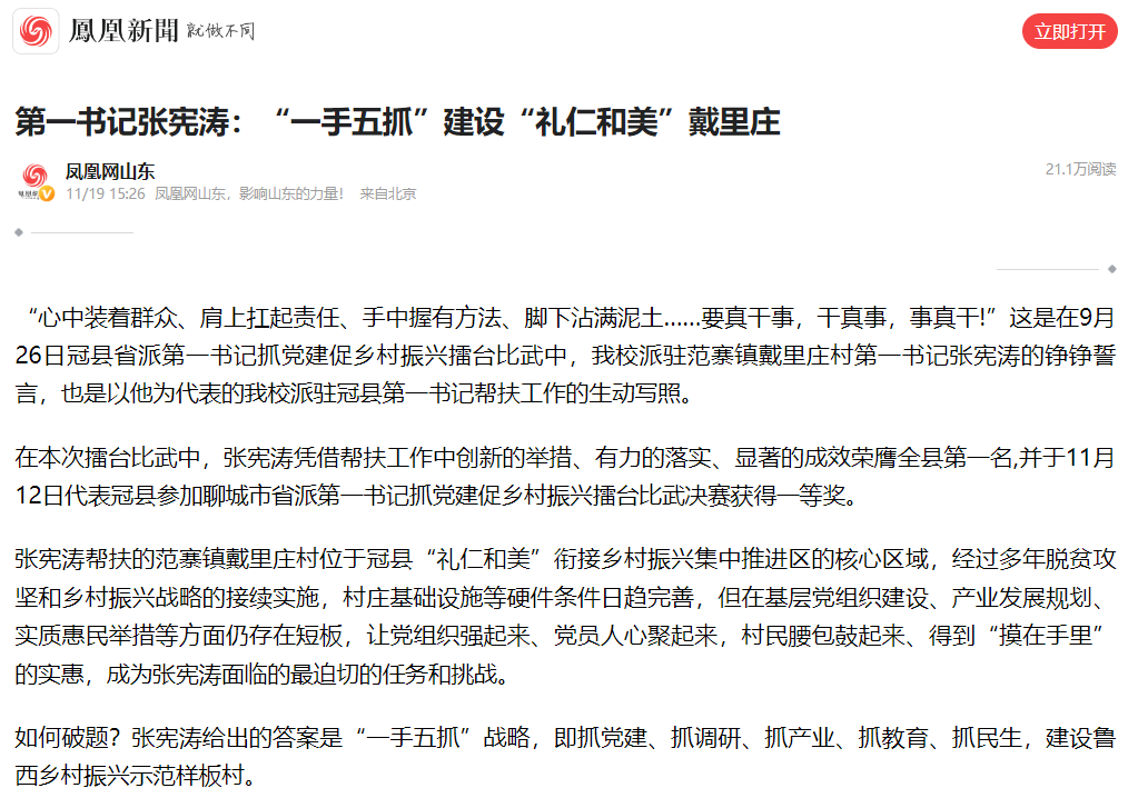 【编者按】11月19日,凤凰网站平台以《第一书记张宪涛:“一手五抓”建设“礼仁和美”戴里庄》为题,报道我校后勤管理服务中心副主任张宪涛担任冠县范寨镇戴里庄村第一书记,抓党建、抓调研、抓产业、抓教育、抓民生,协调争取帮扶资金共计近2000万元,建设鲁西乡村振兴示范样板村的工作情况。