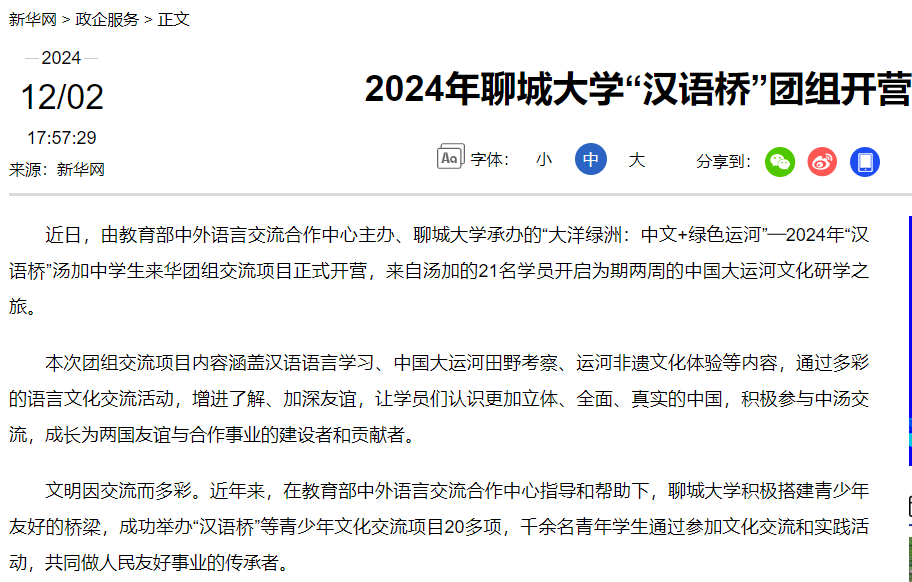 【编者按】12月2日,新华网报道了2024年聊城大学“汉语桥”团组开营的消息;12月3日,中国青年报客户端、中国青年网推出我校党委宣传部记者张兵、刘真真制作的来华团组开营仪式视频。此外,11月27日,大众网对聊城大学“汉语桥”汤加中学生来华团组的营员来到临清亲身感受中国传统文化的深厚底蕴与聊城独有的地域风情的消息进行了报道。