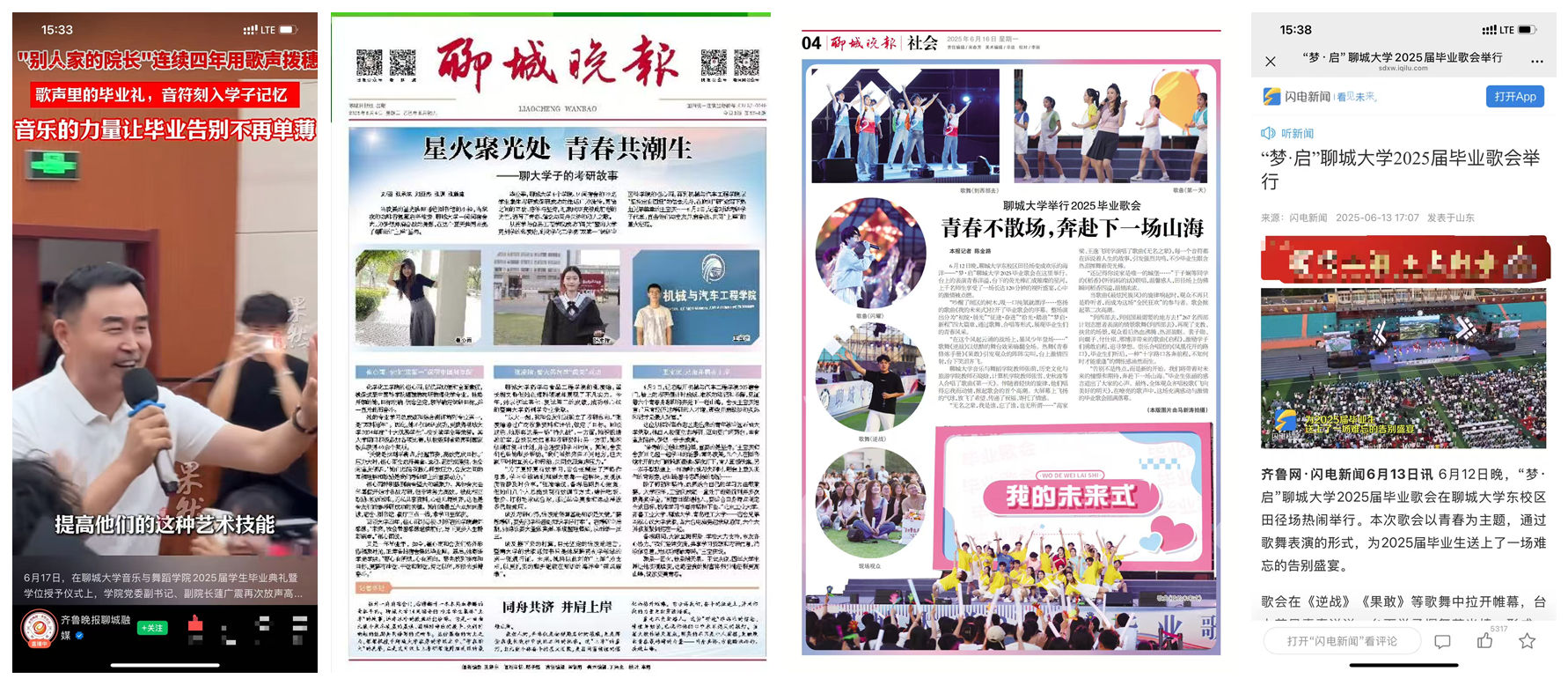 学校党委宣传部邀请齐鲁网·闪电新闻、聊城日报、聊城晚报、大众网等十余家主流媒体对毕业季活动进行全方位报道,并精心制作优质稿件向媒体投稿,3条视频新闻在中国青年报客户端、山东省教育厅官微发布,聊城晚报以整版专题报道毕业歌会盛况。毕业歌会同步在聊城大学视频号、抖音,青春聊大视频号、抖音等平台进行直播,超22万人次于云端互动,共赴这场盛夏告别礼。聊城大学新媒体账号发布了30余条(次)毕业主题短视频,其中单条播放量突破10万+。