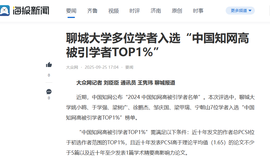 【海报新闻】报道聊城大学多位学者入选“中国知网高被引学者TOP1%”