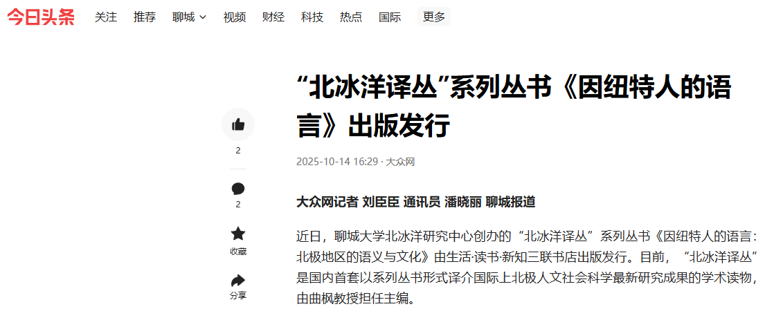 【海报新闻】【今日头条】报道“北冰洋译丛”系列丛书《因纽特人的语言》出版发行