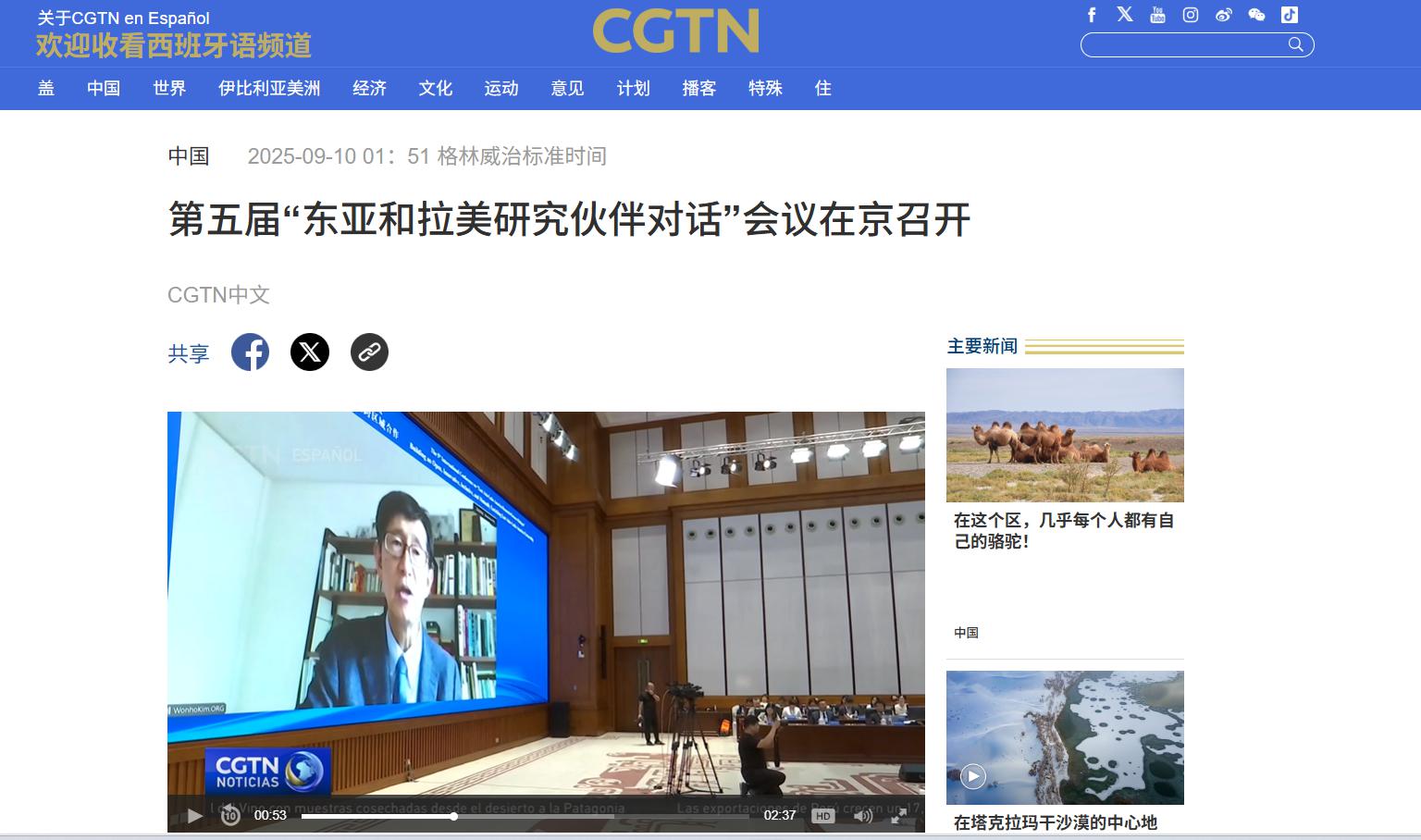 9月10日,第五届“东亚和拉美研究伙伴对话”国际会议在北京成功召开。来自东亚和拉美的百余名官员、专家、学者和青年学生出席了会议,探讨了两地在政策协调、经济学和学术人文交流等方面的未来合作途径和愿景。双方还提出了推动双边合作高质量发展的思路。我校加勒比研究中心特聘教授金元镐先生应邀参会并作了题为“从危机到机遇:东亚与拉美合作论坛奉行包容性多边主义的愿景和行动”(From Crisis to Opportunity: FEALAC's Vision and Action for Inclusive Multilateralism)的主旨报告。中国国际电视台(CGTN)西班牙语频道特别报道了金元镐教授的大会主旨发言。
